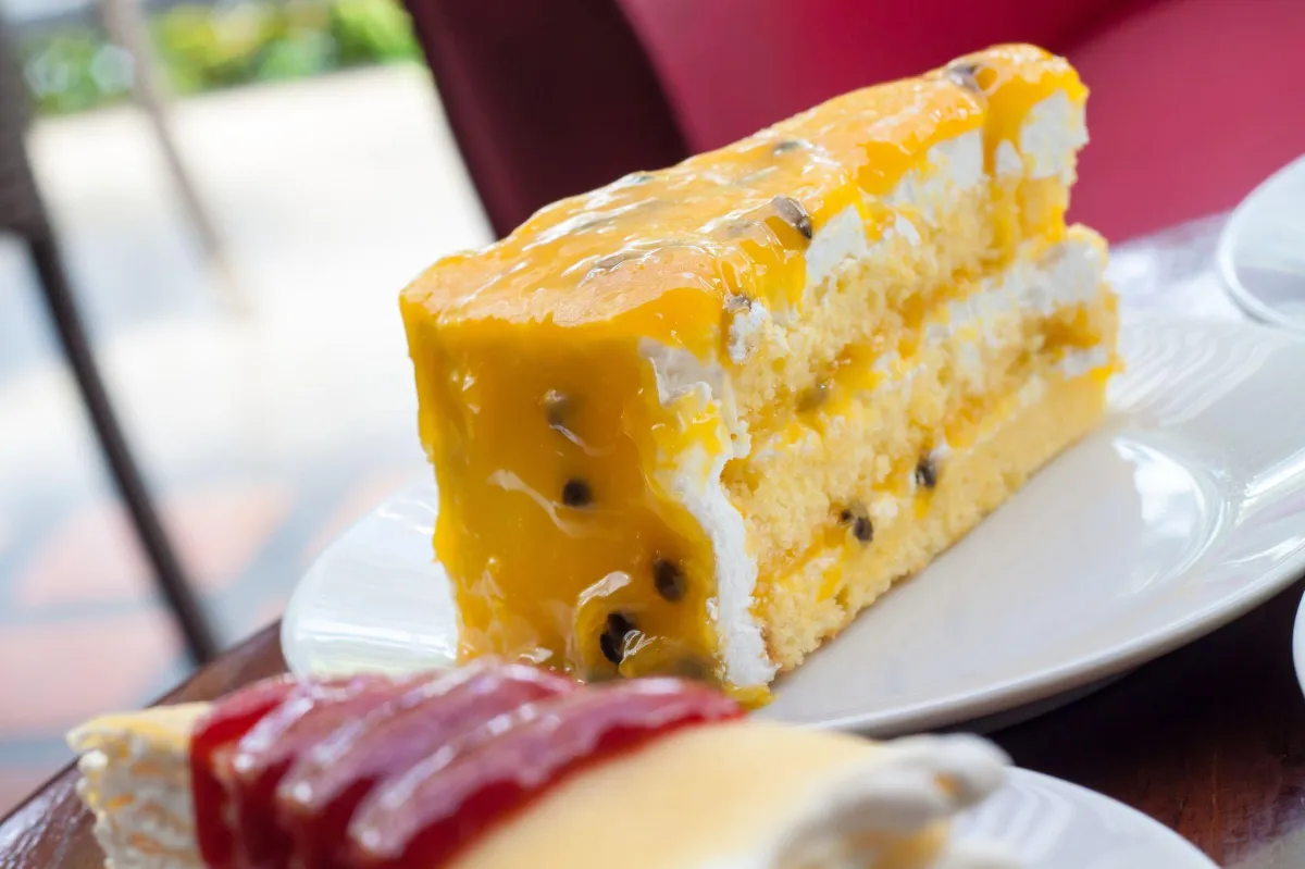 Sprinkle the coconut and reserved passion fruit seeds over the cake. Cut into slices and serve!